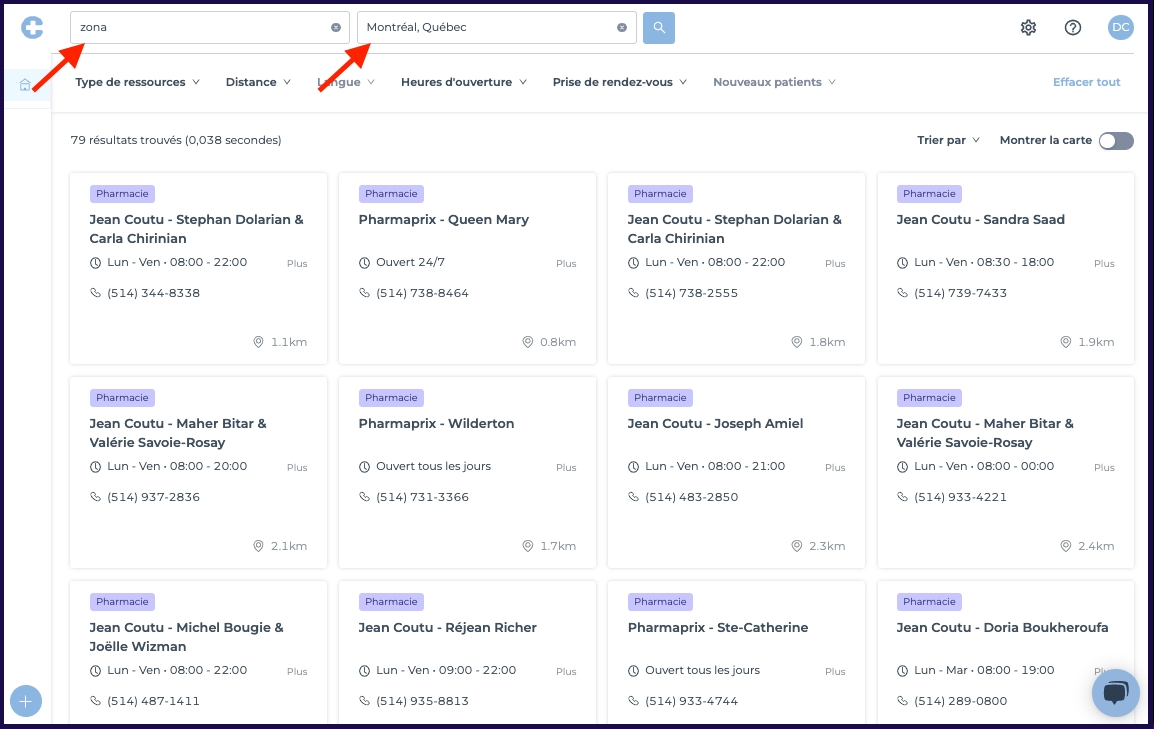 1. Saisissez le service, la spécialité ou le prestataire que vous recherchez dans la barre de recherche et indiquez une localisation.