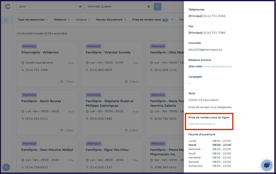 Certaines ressources offrent la possibilité de prendre un rendez-vous en ligne via leur site web. Le Répertoire vous permet de filtrer vos résultats afin de ne voir que les ressources qui proposent un outil de prise de rendez-vous en ligne.