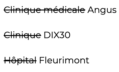 L'algorithme de recherche de Clinia donne la priorité aux concepts médicaux (p. ex. conditions, professions, interventions, parties du corps, etc.) plutôt qu'aux noms propres. Cela signifie que si vous recherchez un établissement spécifique et que vous entrez « Clinique ABC » dans la barre de recherche, l'algorithme pourrait ne pas retourner la clinique ABC comme premier résultat car il donnera la priorité au terme « clinique ».